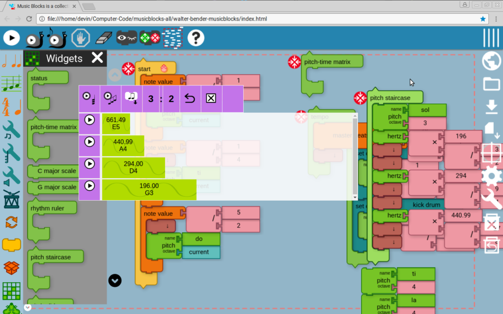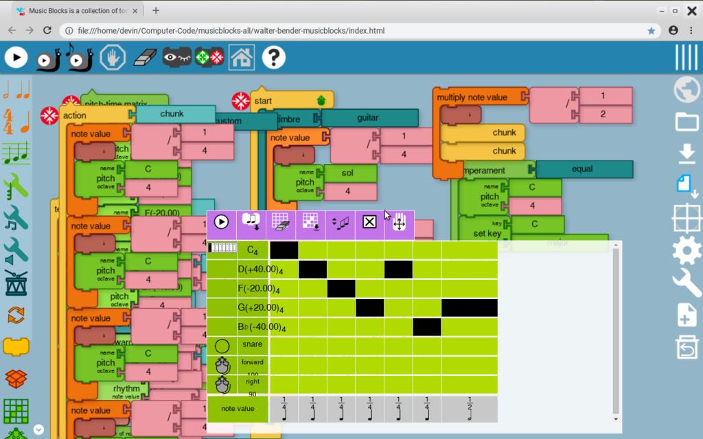 I was asked recently by a team member for our Music Blocks deployment in Japan what the purpose of the widgets is and how they are intended to be used. This post serves as first in a series of drafts aimed to answer this question. This article will focus on Pitch Time Matrix, specifically.